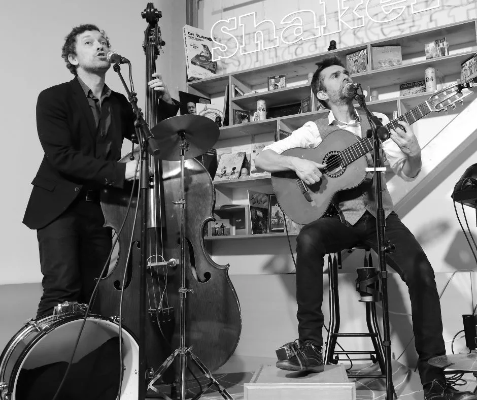 C’est un groupe de chansons à textes. Des textes tantôt acides, tantôt amers mais toujours écrits avec élégance. En une phrase, c’est la langue de Brassens dans la bouche de Jean-Claude Dusse. Emmenés par un parolier désabusé, ces musiciens acoustiques (guitares/percus/contrebasse) répandent leur lyrisme à coups de pompes swing, de mélodies tsiganes et de valses à cinq temps.